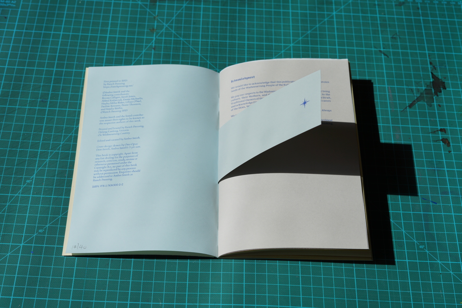 Saddle stitched, risograph publication printed + bound by Ranch Pressing (AU) with original hand drawn covers by Otto Opus Don-Smith.